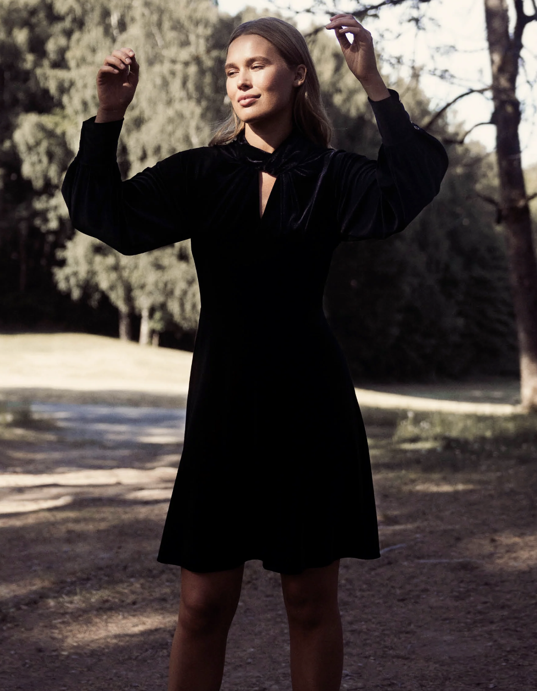 Kjolen har litt puff på ermene, er feminin i fasongen og har en knytedetalj i halsen.