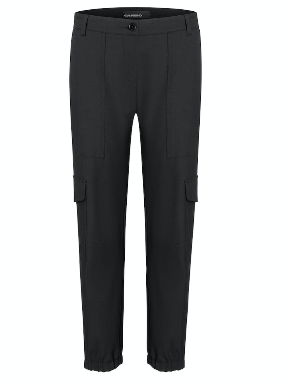 samt en lomme på hver side av beina med trykknapp som lukker den.