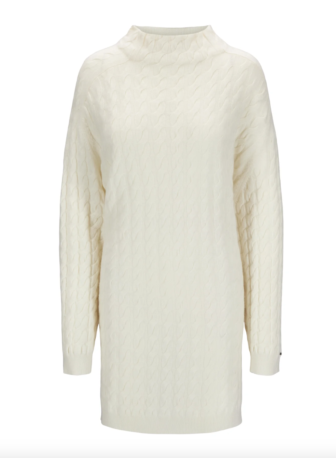 Denne lange og nydelige genseren har et kabelstrikk mønster over hele.