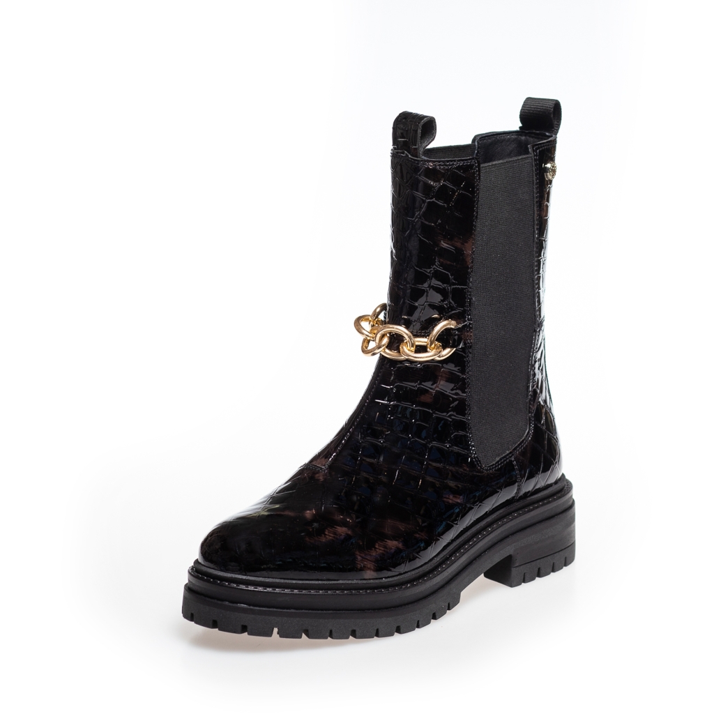 Rålekre Chelsea-støvler i preget lakkskinn i en slående brunsvart nyanse. Vakkert gullkjede som detalj. Ekstra myk innersåle for optimal komfort.