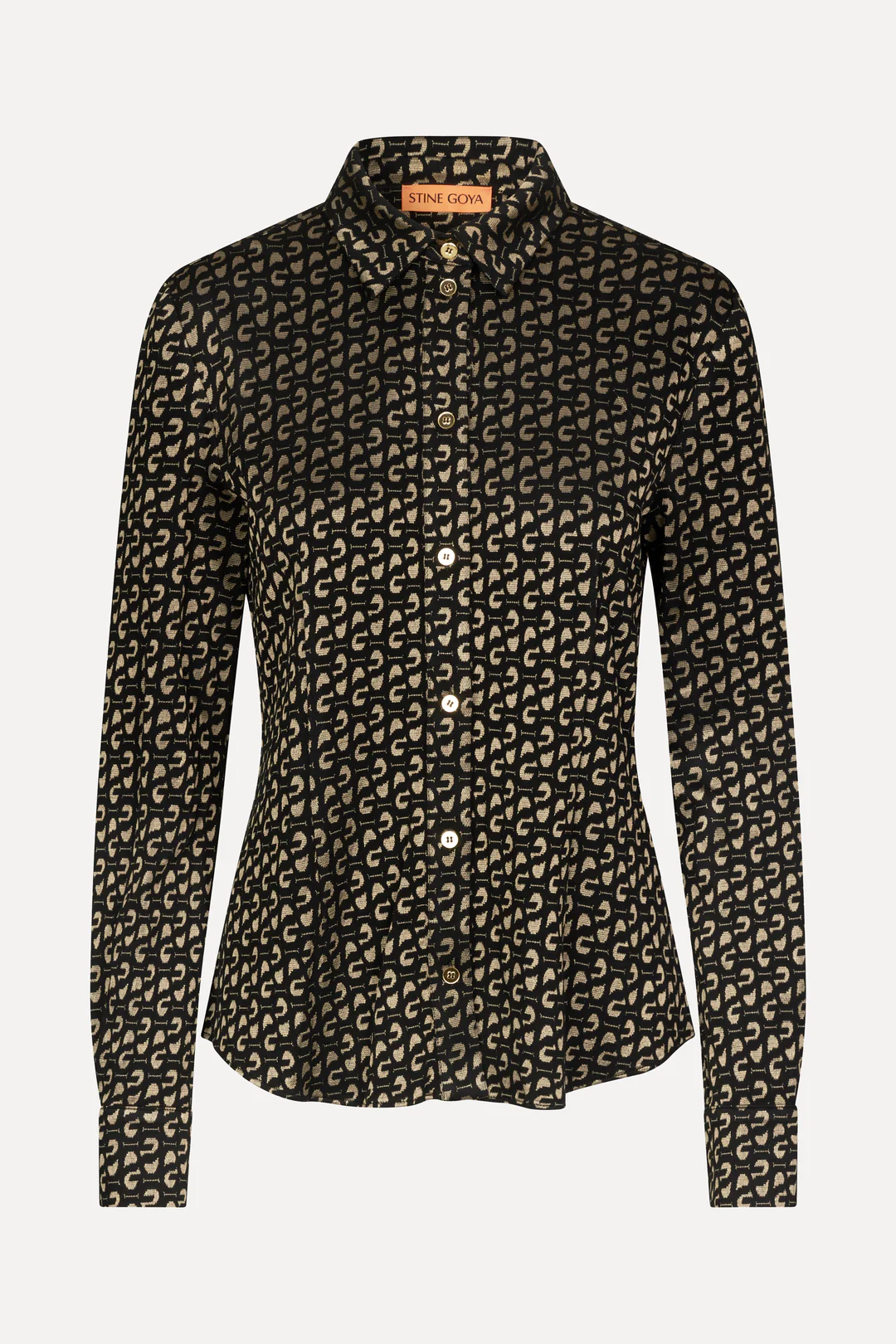 Blusen har lange mansjetter og et detaljert Stine Goya logomønster over hele.