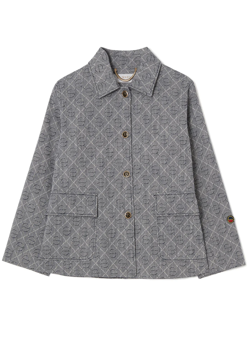 Jakken er detaljert med fire gylne B-knapper og Busnel logoen i jacquard over hele.