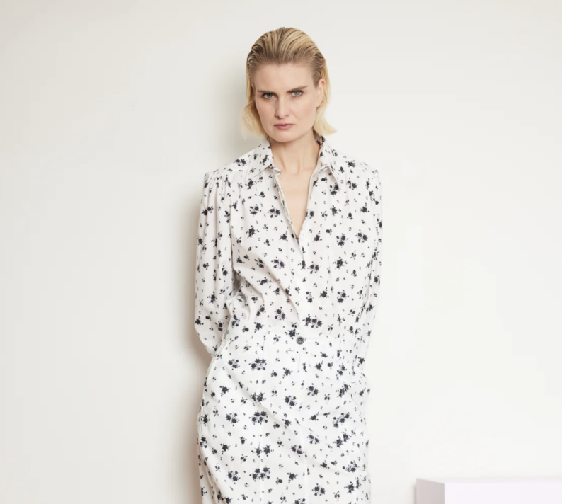 Det er små mansjetter på ermene, og skjorten er i sesongens tøffe farger og print.