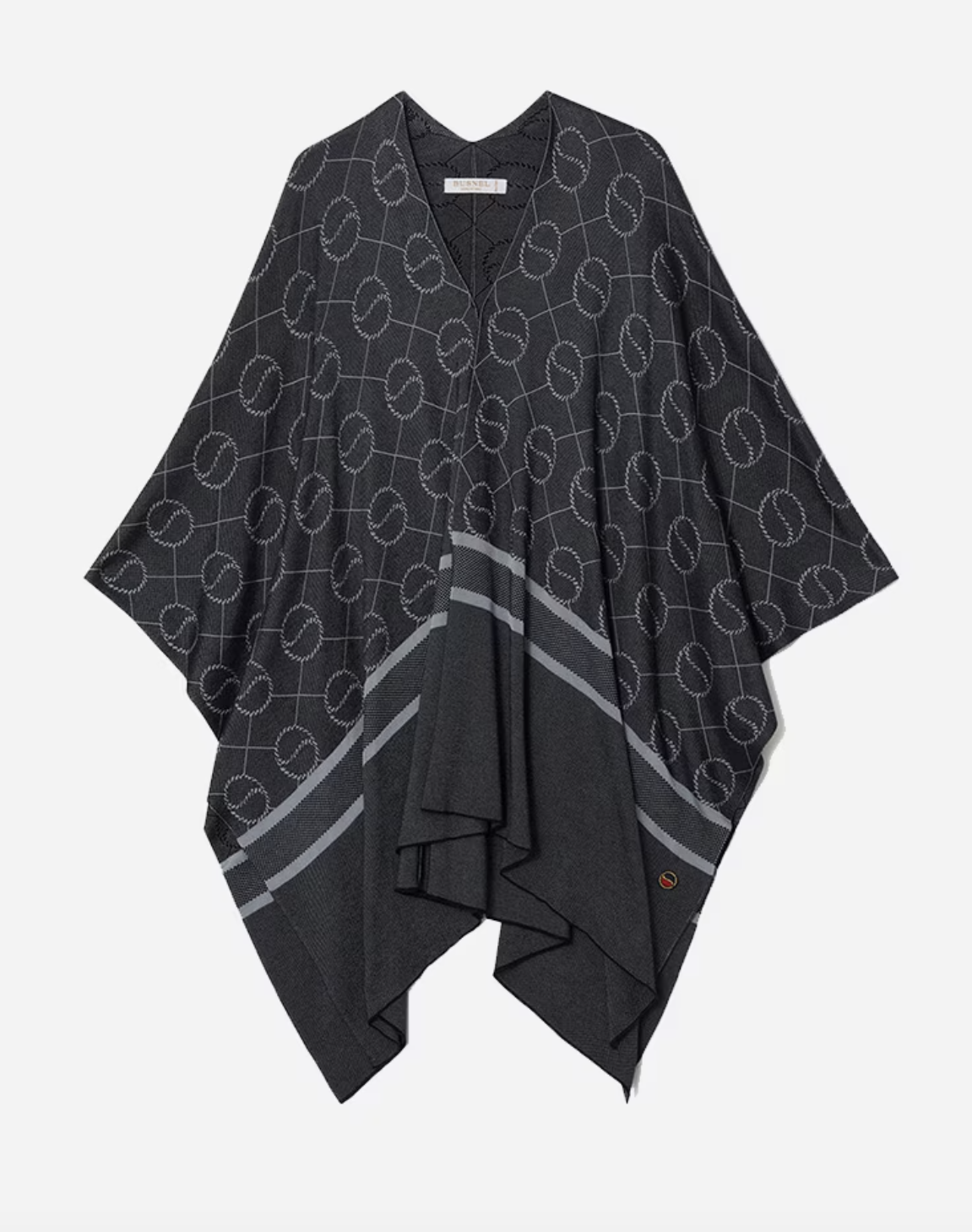 Dette er en nydelig poncho laget i den mykeste merinoull, detaljert med Busnel-logo jacquard over hele.