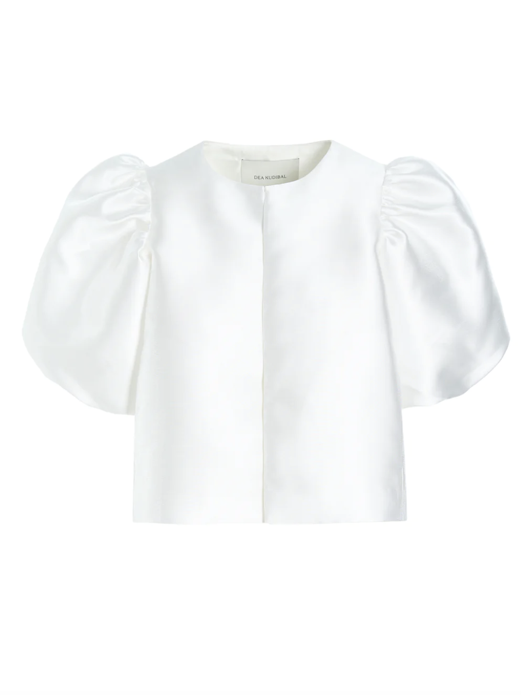 Laget i blank hvit taft, kan denne allsidige jakken brukes alene som en bluse, over en kjole eller som en liten kveldsjakke.