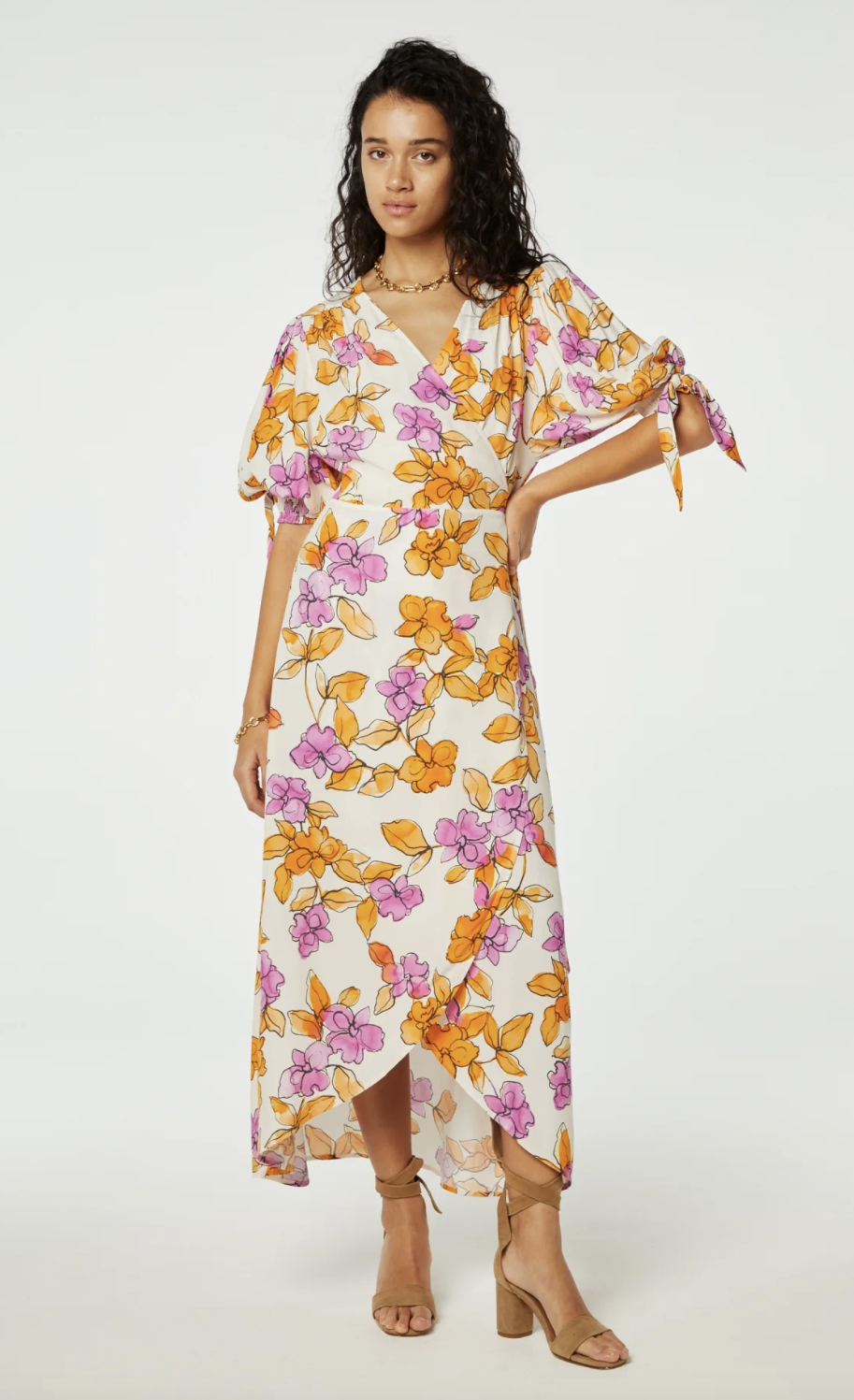 Kjolen har v-hals og korte voluminøse ermer, og har et all-over orkide trykk.